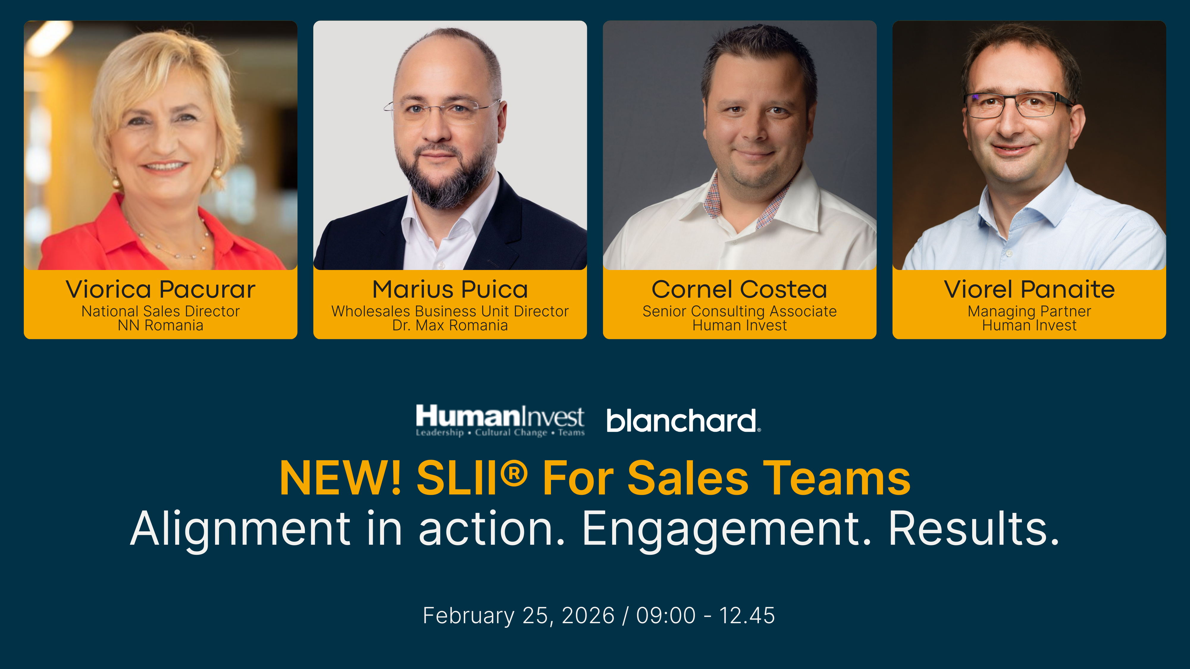 Te invitam Miercuri, 25 februarie 2026, intre orele 09:00 – 12:45, la evenimentul de lansare a noului nostru program SLII for Sales Teams! Programul are un design special construit pentru echipele de vanzari si are ca scop cresterea rezultatelor fortei de vanzare, prin cresterea productivitatii conversatiilor si a interactiunilor managerilor de vanzari cu cei din echipele lor. SLII for Sales Teams ii ajuta pe manageri sa obtina o aliniere mai rapida cu cei pe care ii conduc si o implicare mai buna a acestora in realizarea prioritatilor si a proceselor cheie!